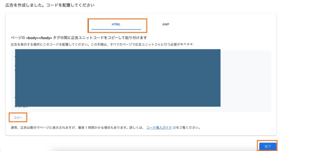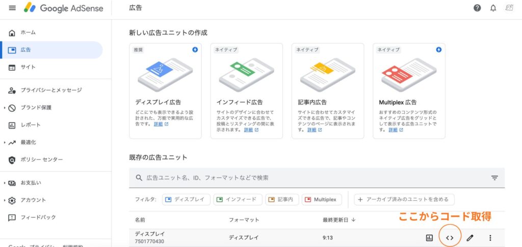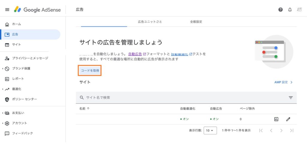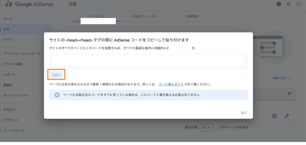 管理画面から自動広告の設定のところにコピーしたコードを貼り付け。