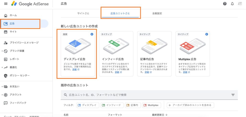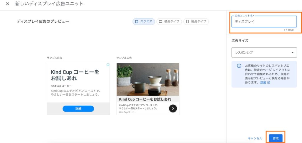 広告ユニット名に自分がわかりやすい名前を入力したら作成をクリックしましょう。