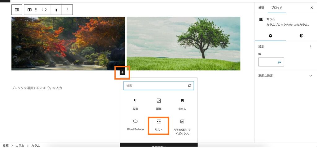 ブログでは記事内に写真を横に並べることができ、写真の下に説明を入れたい場合は写真の➕を押すことで下にリストを追加することもできます。